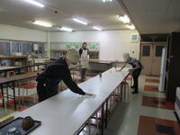 2日目。この日は,食堂掃除とワックスがけ,乾燥室の物干し台と竿を元に戻す作業を2班に分かれて行いました。食堂掃除では,ポリッシャーという床掃除専用の機械を使用しました。扱いが難しく,慣れが必要な機械ですが,作業班で使ったことがある生徒が,経験を生かして丁寧に仕上げてくれました。乾燥室では,とても重い物干し台18台,支柱と竿も全部元に戻しました。