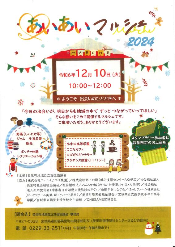 令和6年12月10日(火)に、美里町地域自立支援協議会が主催する「あいあいマルシェ 2024」に本校が参加します。木工芸班が製作した木工製品、園芸班が育てた野菜、食品加工班で作ったクッキーなど、日頃の活動の中で生徒達が手がけた作業製品を販売する「コゴガクマルシェ」、接客班による「こごたカフェ」、フラダンス部によるステージ発表を行います。皆様には日頃の学習活動の成果をぜひご覧いただければと思います。
