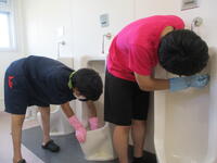 トイレの便器洗い、排水溝掃除を行いました。いつも使っている用具ではないもので、細かいところまでみんな夢中になって便器を磨いていました。