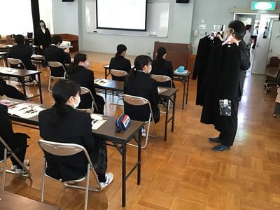 本物のスーツを目の前にして,生徒たちは講師の先生方から様々なアドバイスをいただきました。この講座を通して,生徒たちは,社会人としてふさわしい服装はどのようなものなのかについてあらためて考えていたようでした。