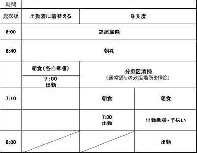 自分の食事を準備し、みんなが朝礼を行っている時間に食べ始めます。