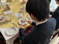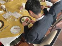 当日は「ほうれん草とベーコンのキッシュ」,「真鯛と大根のポワレ 香草入りブールブランソース 長葱のフリット添え」など,本校の農産物をふんだんに料理に取り入れていただきました。生徒たちは,初めに基本的なテーブルマナーを教わり,フルコース料理を頂きました。「ナイフとフォークは音をたてないように気を付けて食べましょう」など基本的な食事のマナーをご指導いただきました。最初は緊張感にあふれ,食事どころではなかったようですが,次々と目の前に運ばれてくる美しい料理を見て感動し,次第に笑顔で食事をする場面が見られるようになりました。その後,「社会人としての心構え」をテーマに講演をしていただきました。時間を守ることや笑顔であいさつすることなど,社会人として必要なこと学びました。