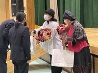 本校では日々の給食調理とともに,寄宿舎の夕食,朝食も8人の調理員の皆さんが調理しています。この日は献立を考えてくれている栄養教諭と4人の調理員の皆さんに,生徒代表が感謝の言葉を述べ,作業学習で制作している作業製品セットを手渡しました。