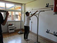 2日目。この日は,食堂掃除とワックスがけ,乾燥室の物干し台と竿を元に戻す作業を2班に分かれて行いました。食堂掃除では,ポリッシャーという床掃除専用の機械を使用しました。扱いが難しく,慣れが必要な機械ですが,作業班で使ったことがある生徒が,経験を生かして丁寧に仕上げてくれました。乾燥室では,とても重い物干し台18台,支柱と竿も全部元に戻しました。