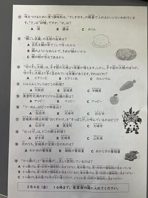 1月31日(月) より1週間,本校は給食週間になります。この期間中は,これまで給食の時間に毎日発行してきた「もぐもぐ通信」からクイズを出題する『もぐもぐ検定』を行います。生徒たちは,話し合ったり,これまでの「もぐもぐ通信」を調べたりしながら解答していました。