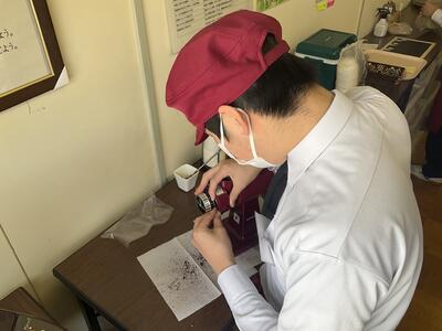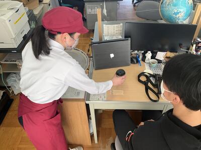 接客班では,卒業前最後となる「こごたカフェ」を行いました。先生方から電話注文や訪問販売で注文を受けた生徒たちは,受け応えをしながら伝票を書いたり,生豆の選別から取り組んだ自家焙煎コーヒーを手際よく準備したりしていました。