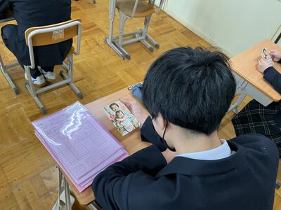 聞き手に本の魅力を感じてもらうために,「どのようなことばや表現で相手に伝えるか」がバトルのカギとなってきます。生徒たちは,「この本のおかげでポジティブな考えをもてるようになった」とか,「働いてからの人間関係に役立つ」など,自分のことばで思い思いに「おすすめポイント」を伝え合っていました。