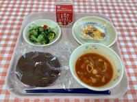 今日の給食の「松風焼き」は、鶏挽肉で作ったみそ味のハンバーグみたいなものです。給食では表面に「ごま」をまぶしてありますが、本来の松風焼きは「ケシの実」(あんパンの上にくっついていることがある小さい粒々)をまぶします。