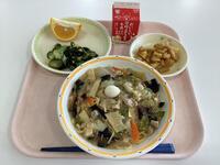 今日の給食の「フルーツポンチ」は、サイダーに「もも」「パイン」「みかん」と「いちごゼリー」を入れました。
