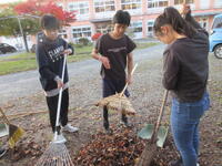 紅葉がきれいな季節になりました。寄宿舎周辺の木々も色づき、春に綺麗な花を咲かせていた桜の大木は落葉しています。また、朝掃除をしている際や夕方外遊びをしている際には、渡り鳥の飛んでいる姿も見られ、すっかり秋を感じます。落ち葉掃きも毎年恒例になっています。