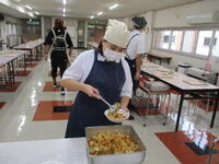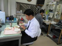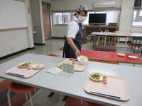 起床はいつも通りの時間ですが、出発時間が早い人は先に出勤着に着替えます。朝礼前後の活動は普段より時間を早めて行っています。6:30と7:00に出発する生徒は職員室で個別に食事を摂り、朝食の配膳は7:20~30に出発する3名の1年生と指導員で行っています。