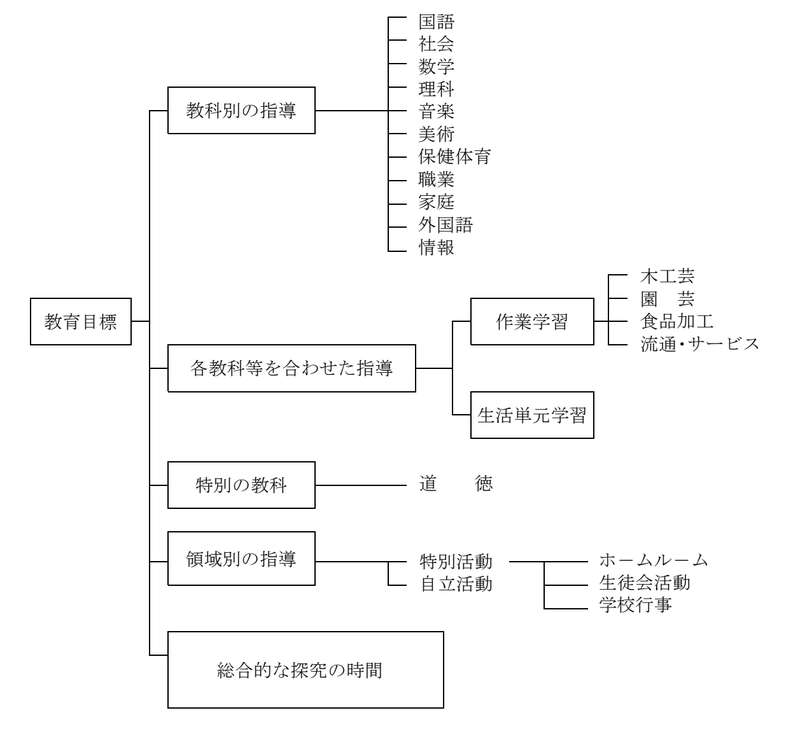 - 各教科、各教科等を合わせた指導、領域別の指導、総合的な探究の時間で編成する。ただし、道徳教育については全体計画を作成し、自立活動については、個別の指導計画に基づき教育活動全体を通して指導する。