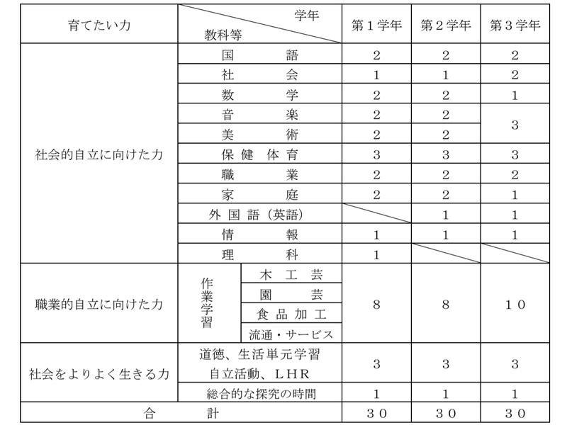 - 授業は年間35週とし、1週30単位時間とする。また、1単位時間は学校及び生徒の実態、寄宿舎における指導を考慮し45分間とする。